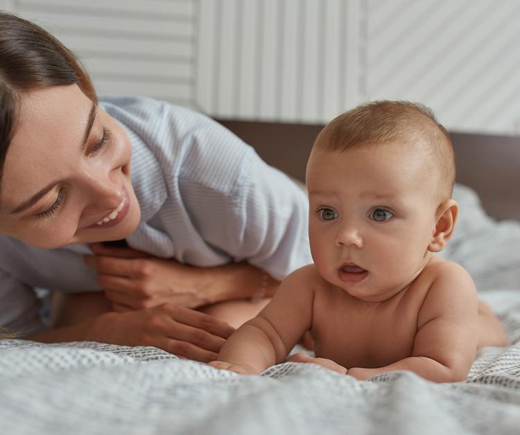 Try skipping the clothes! Naked tummy time (with or without a diaper) gives baby the opportunity to experience new sensory inputs to their whole body and make cognitive connections. You may notice your baby moving more freely when their clothes are off. Just make sure to utilize a washable or wipeable surface in case of any accidents—you’ll only make that mistake once!