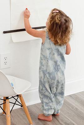 Can we just take a moment and talk about this DIY coloring wall with hanging paper roll and magnetic chalkboard? It’s been SO fun to use! I have a house full of little artists, especially my youngest, and this is a great way to celebrate her milestones and independence – giving her a place to really explore her creative side, while not having to be too far away, or in another room while I’m working in the kitchen.
